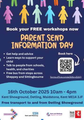 - Parent SEND Information Day on Thursday 16th October at the Detling Showground. Please see the poster listed below for the booking QR code.