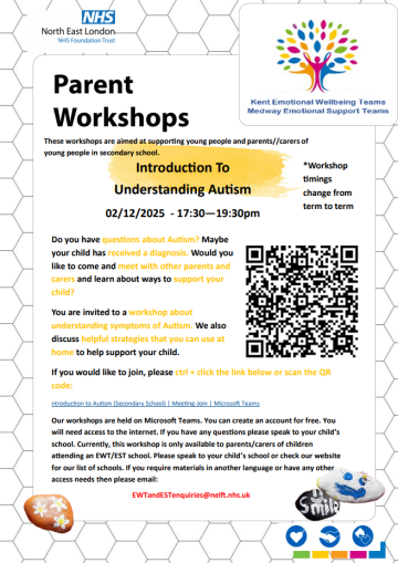 - Parent workshop, Introduction to Understanding Autism - further information can be found on the poster below.