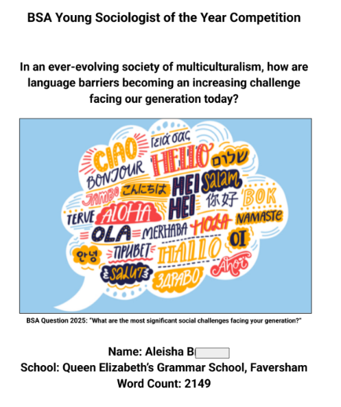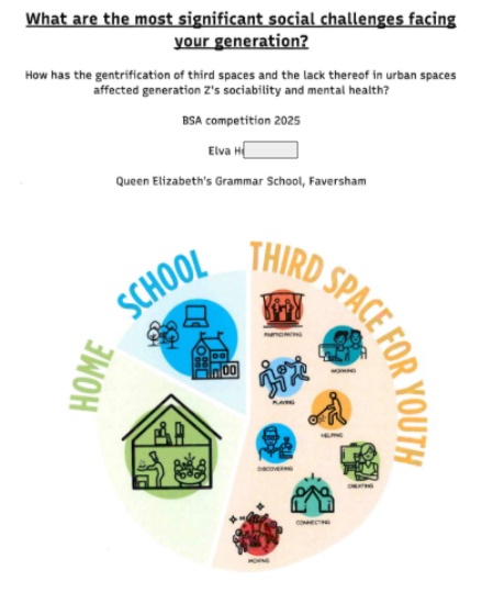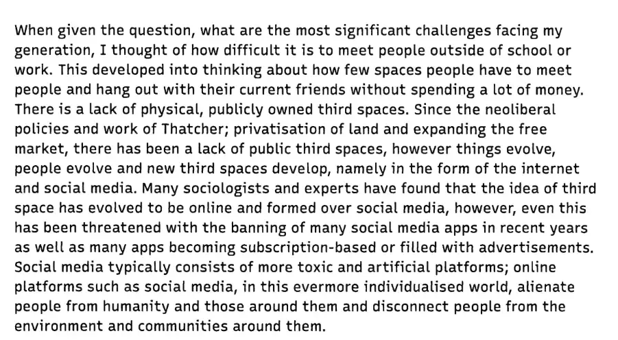 Congratulations to Elva. H for her essay, 'How has the gentrification of third spaces and the lack thereof in urban spaces affected generation Z's sociability and mental health?', which was one of three runners up, and to Aleisha. B for her essay, 'In an ever-evolving society of multiculturalism, how are language barriers becoming an increasing challenge facing our generation today?', which was shortlisted as part of the top 10 entries.